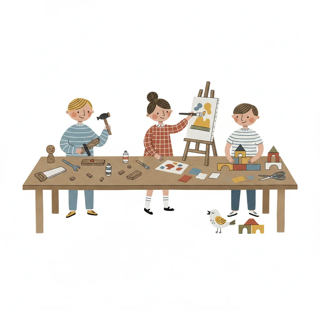 Illustration von drei Kindern, die an einem Tisch malen, hämmern und mit Bausteinen spielen.