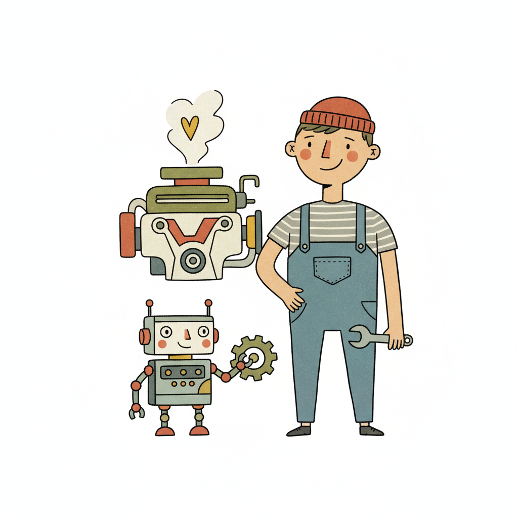 Ein Handwerker mit Werkzeugen in bunter, kindlicher Darstellung.