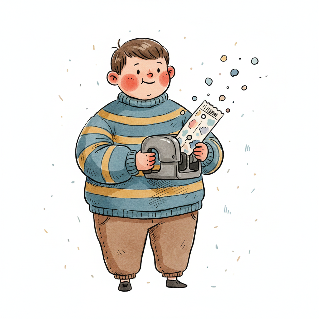 Niedliche, kindgerecht illustrierte Szene mit einem Kind oder einer Person als Hauptfigur, vor rein weißem Hintergrund, im frech-nordischen Aquarell-Skizzenstil. Klare, leicht wackelige Tuschekonturen, sichtbare Pinsel- und Strichtextur, dezente Schraffuren, weiche handgemalte Farbflächen in gedeckten Farben. Einfache, runde Formen. Keine harten Schatten, sondern sanfte, transparente Aquarellschichten. Leicht raue, handgezeichnete Linien statt glatter Vektorkanten. Subtile, vereinzelte Kritzelpunkte oder kleine Details im Hintergrund (wie Pünktchen oder feine Striche), aber keine echte Umgebung oder Landschaft. Die Figur ist mittig zentriert. Insgesamt charmant, humorvoll, warm und handgemacht wirkend. WICHTIG: Das Bild darf ABSOLUT KEINEN TEXT, KEINE BUCHSTABEN und KEINE ZAHLEN enthalten.