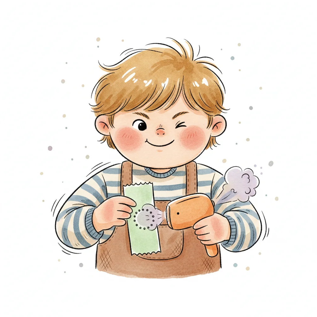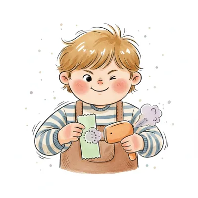 Ein fröhlicher Junge winkt und benutzt ein Gerät, das Dampf auf ein Papier abgibt.