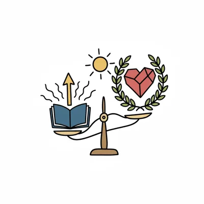 Eine Waage balanciert Wissen (Buch, Sonne) und Herz (Lorbeerkranz). Symbol für Bildung und Werte.