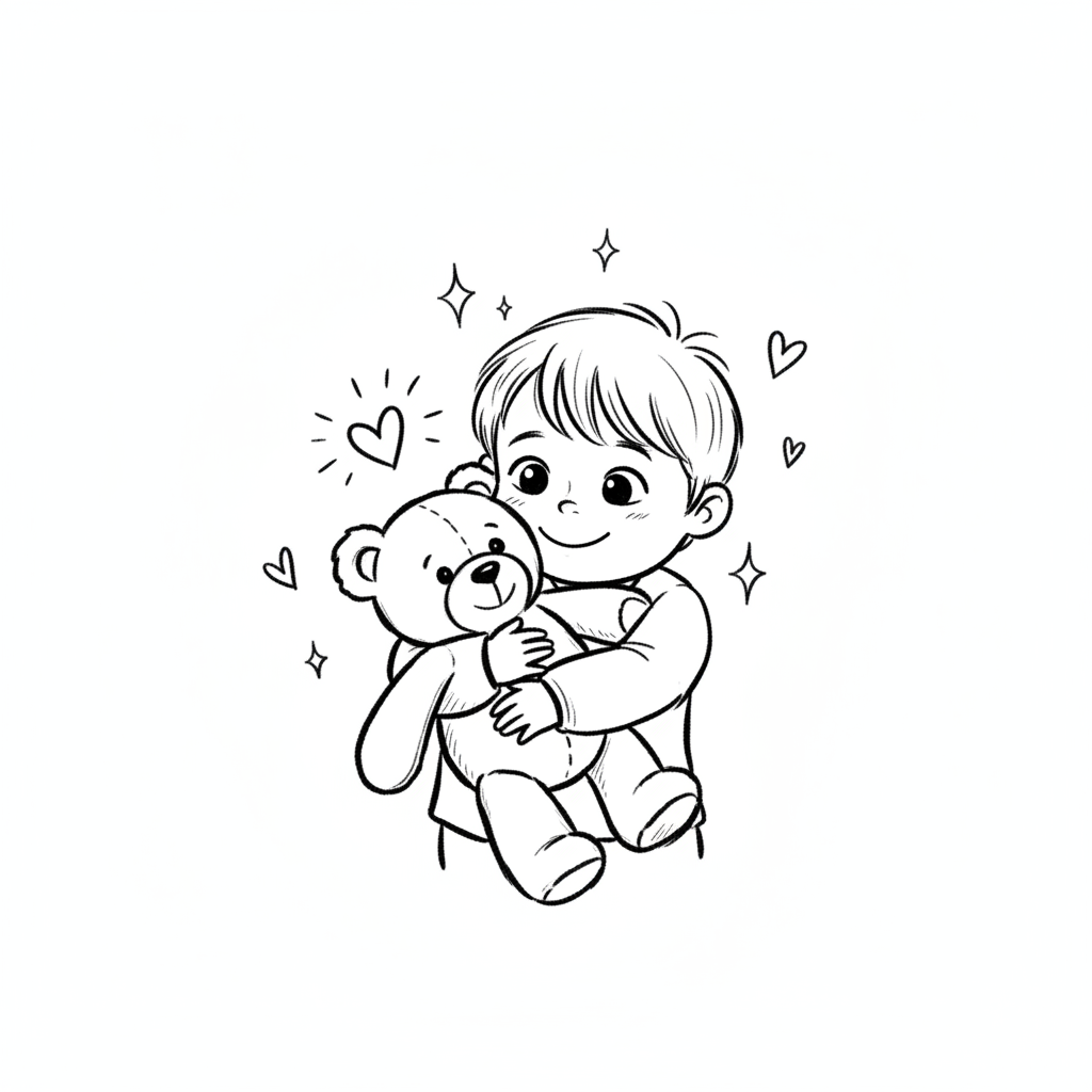 Schwarz-Weiß-Zeichnung eines lächelnden Kindes, das einen Teddybär umarmt, mit Herzen und Sternen.