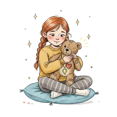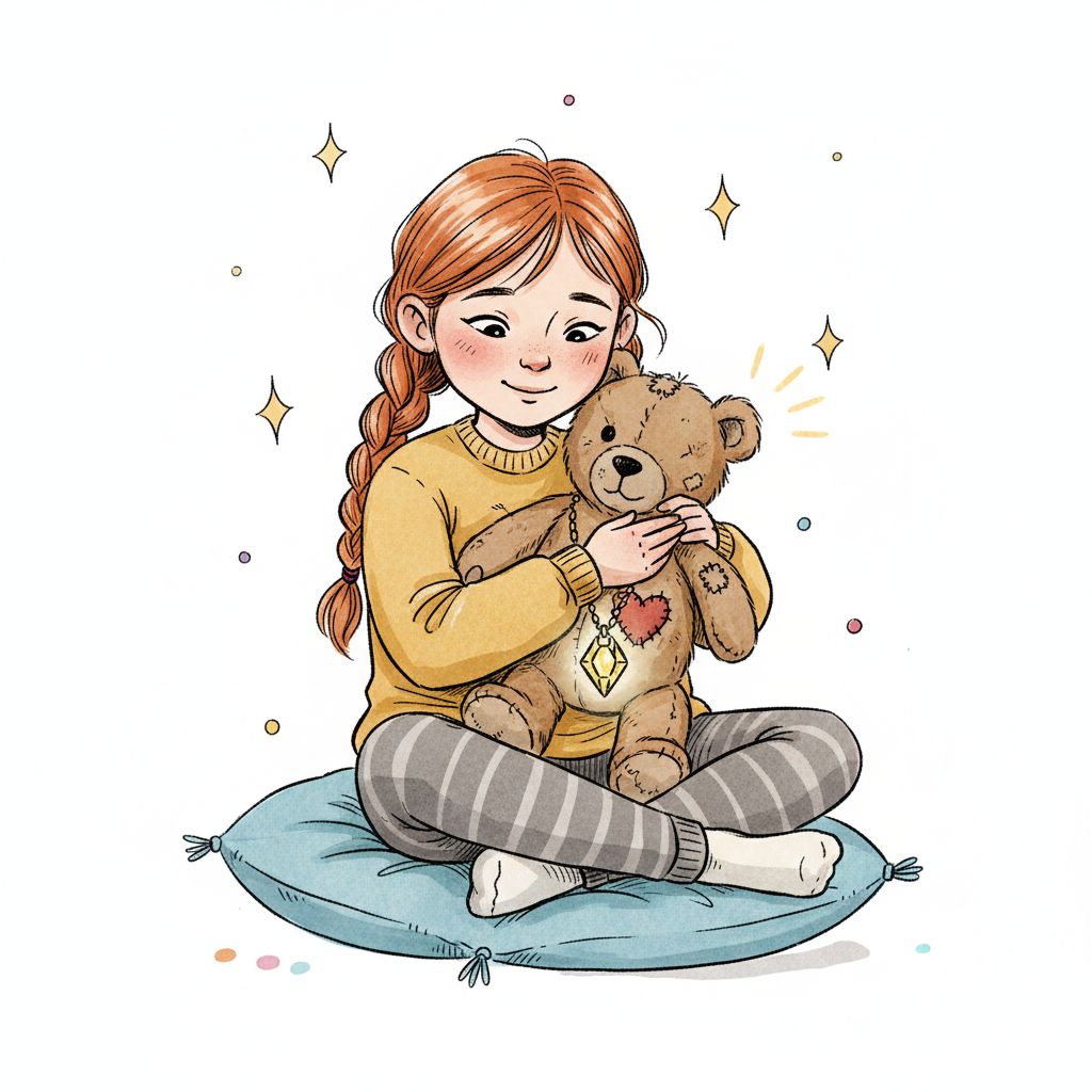 Ein lächelndes Mädchen mit roten Zöpfen umarmt liebevoll ihren Teddybär auf einem Kissen.
