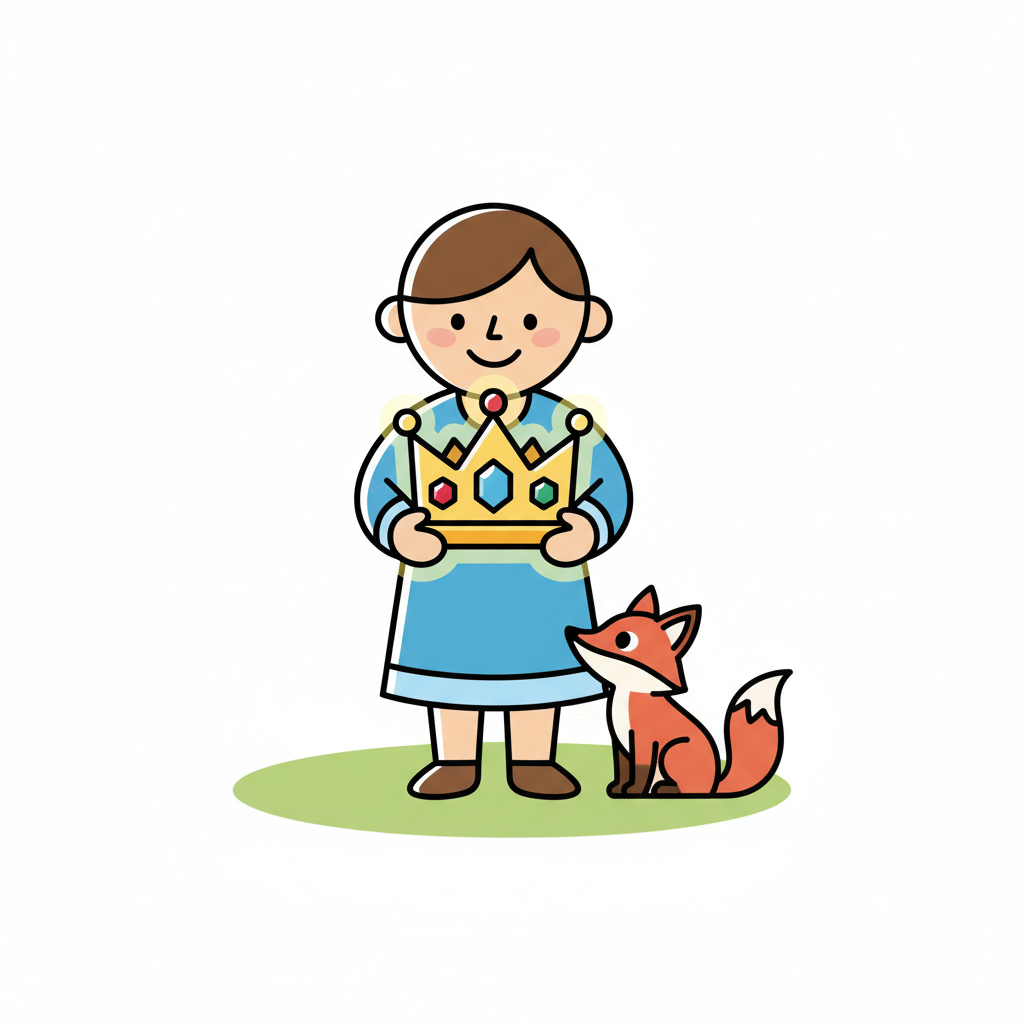 Kind hält Krone, daneben sitzt ein Fuchs. Illustration im Stil des Kleinen Prinzen.
