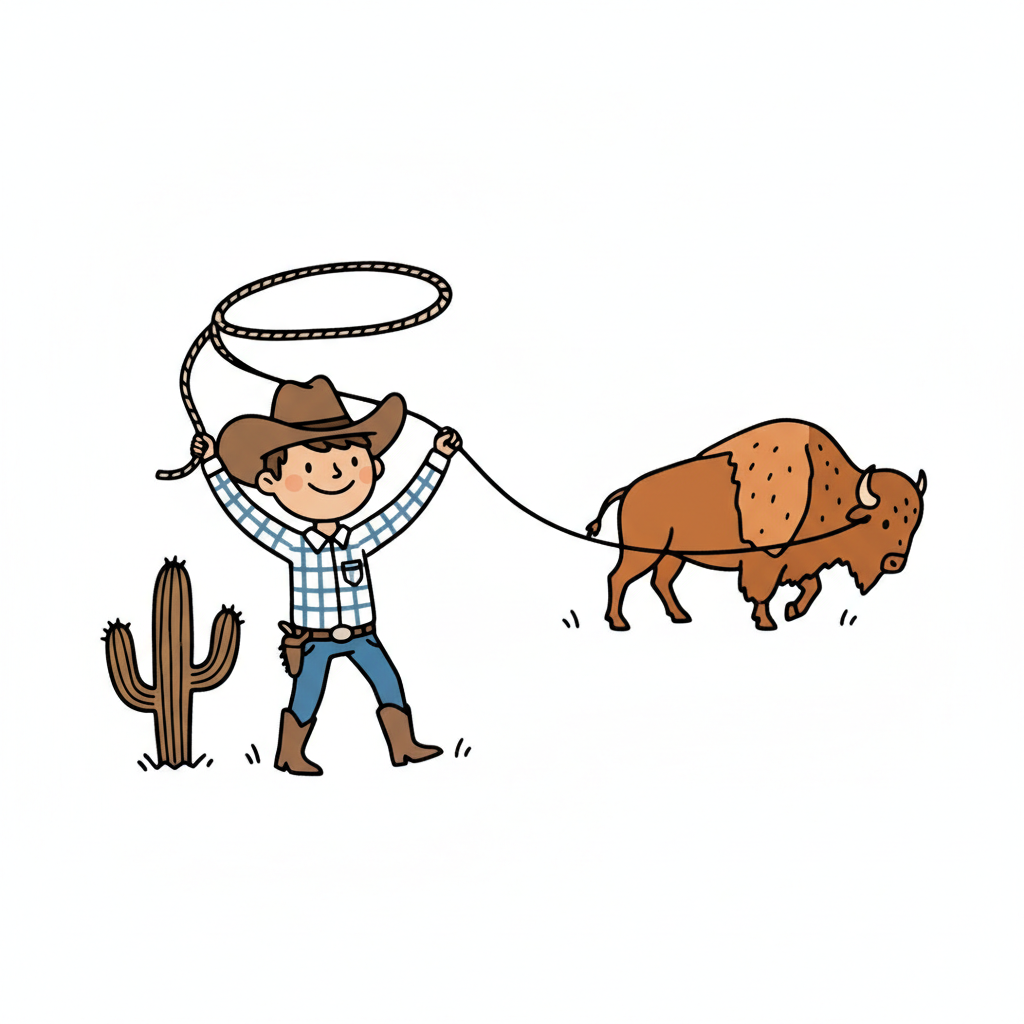 Ein lächelnder Cartoon-Cowboy führt einen Bison mit einem Lasso, neben einem Kaktus.