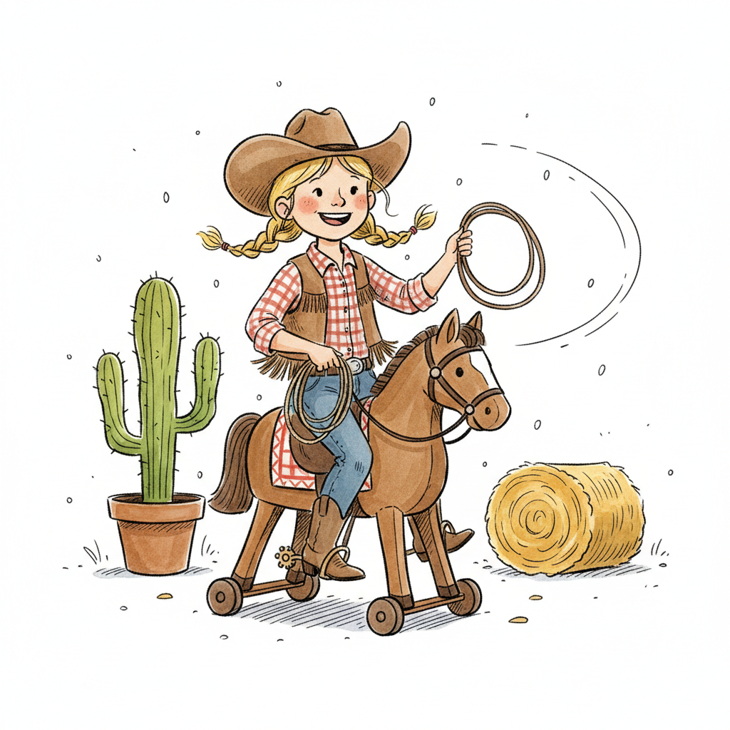 Ein lächelndes Cowgirl-Mädchen reitet ein Spielzeugpferd, hält ein Lasso, mit Kaktus und Heuballen.