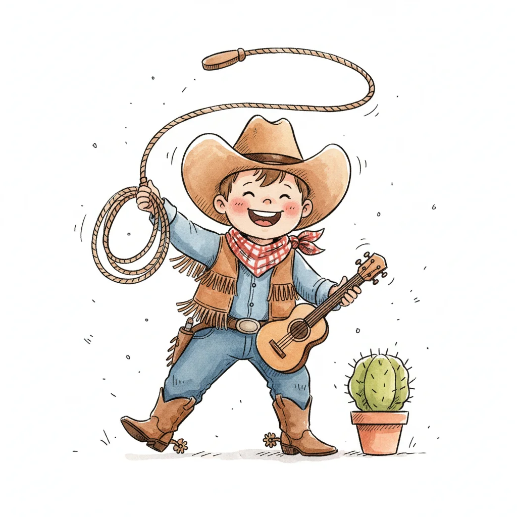 Fröhlicher Cartoon-Cowboy-Junge mit Lasso und Gitarre neben einem Kaktus.
