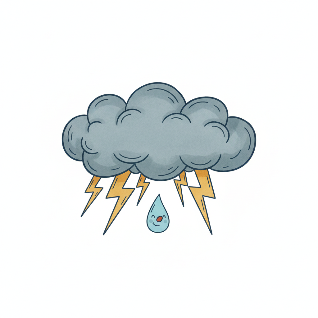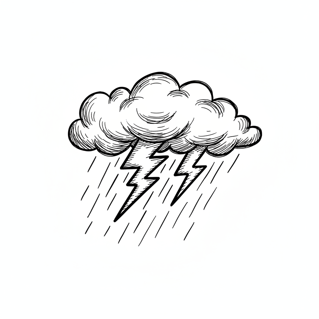 Eine Wolke mit Blitz und Regen in Schwarz-Weiß-Zeichnung.