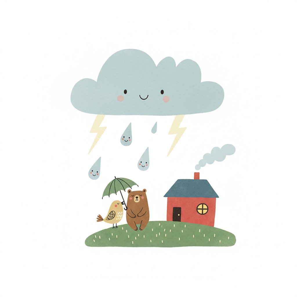 Niedliches Bild von einem Bären und Vogel unter einer Wolke mit Regen.