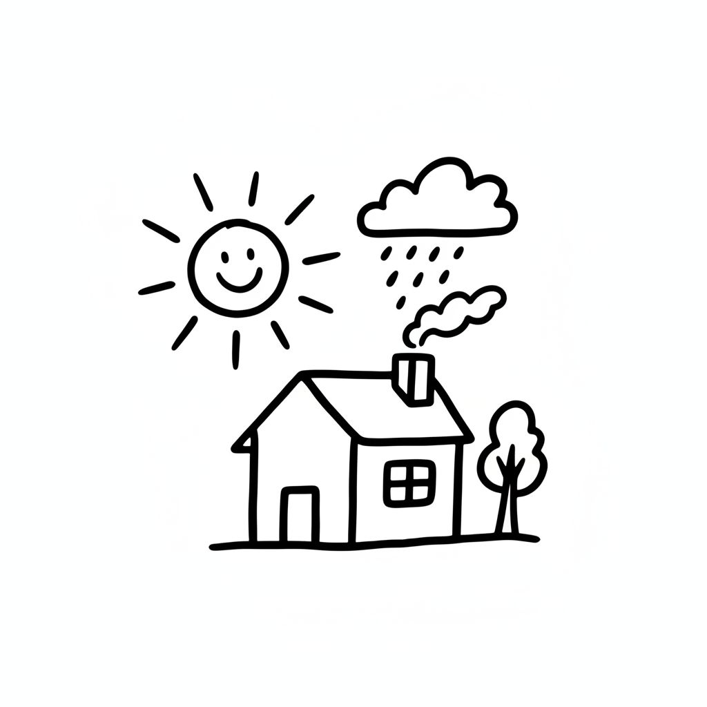 Ein einfaches Haus unter Sonne und Regen mit einem lächelnden Gesicht.