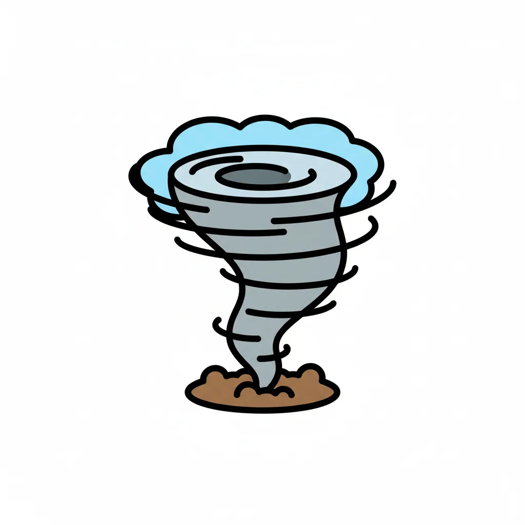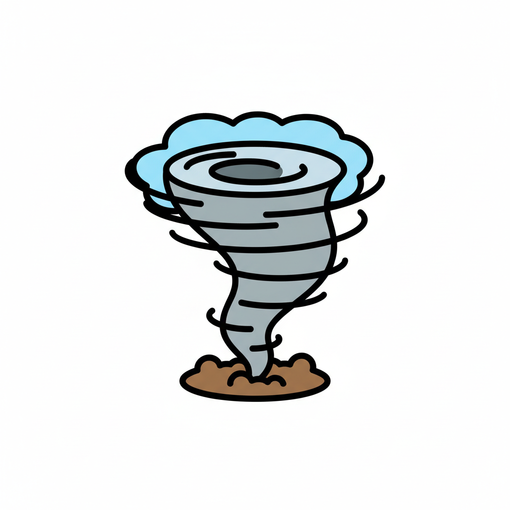 Ein stilisierter Tornado mit Wolken und Staub.
