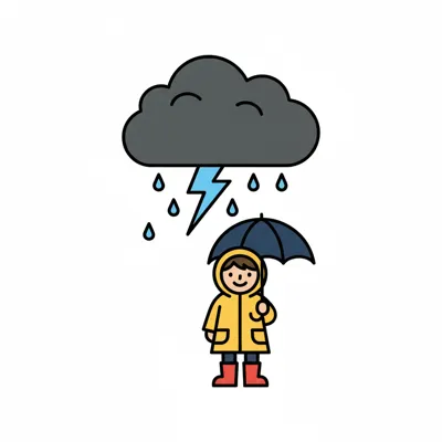 Ein lächelndes Wesen steht unter einem Wolken- und Blitzregen.