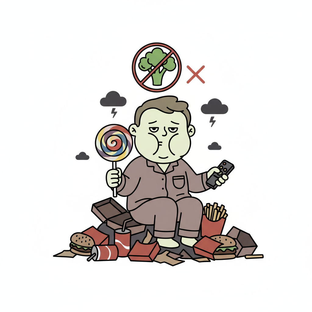 Übergewichtiger Mann in Pyjama sitzt auf Fast-Food-Müll, isst Lutscher, schaut TV, lehnt Brokkoli ab.