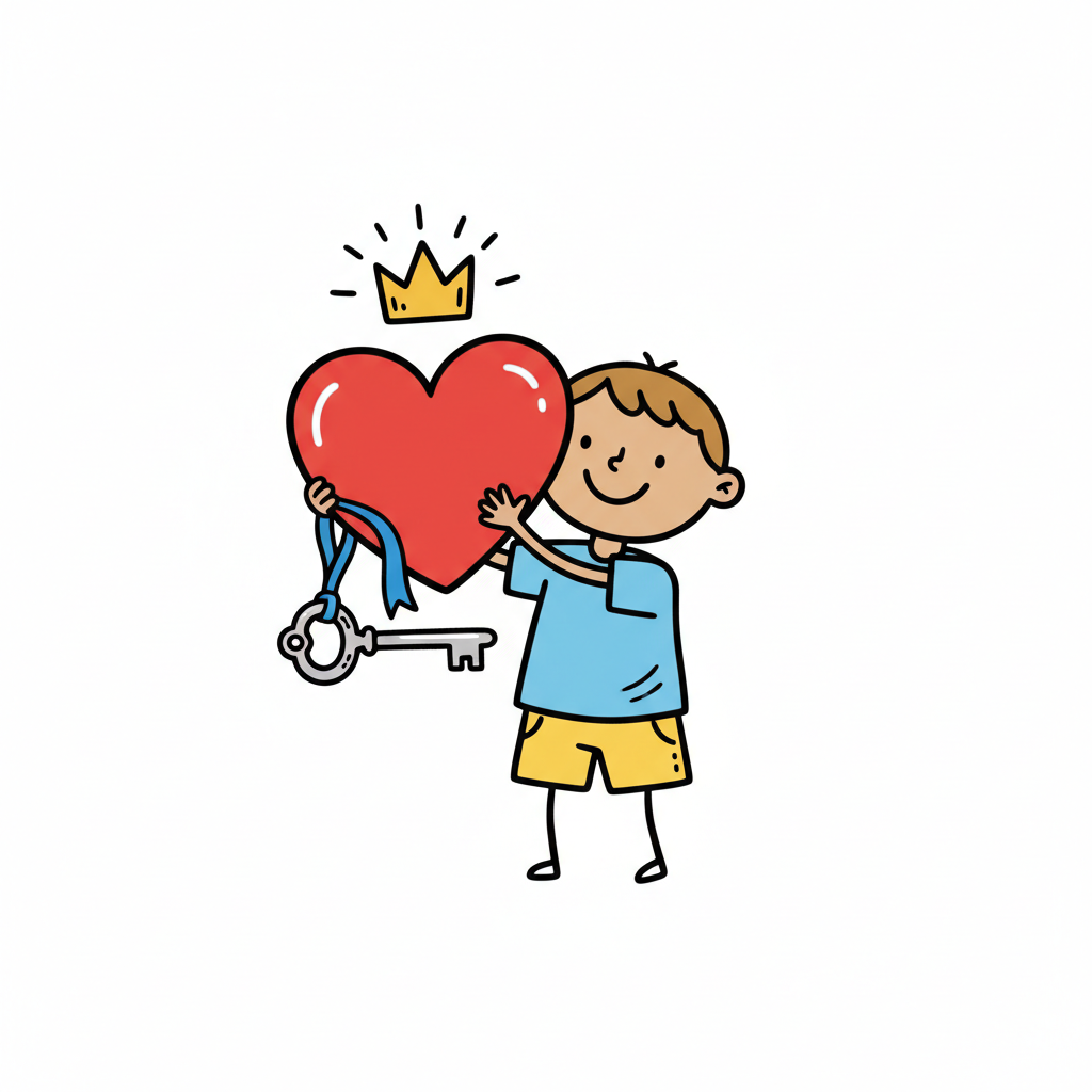 Ein lächelnder Junge hält ein rotes Herz mit einem Schlüssel und einer Krone darüber.