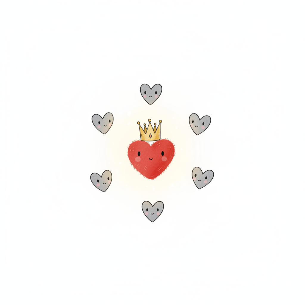 Niedliches rotes Herz mit Krone, umringt von sechs lächelnden grauen Herzen auf weißem Grund.