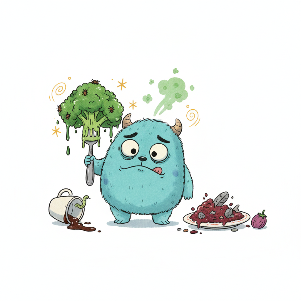 Blaues Monster ekelt sich vor verdorbenem Essen und madigem Brokkoli auf der Gabel.
