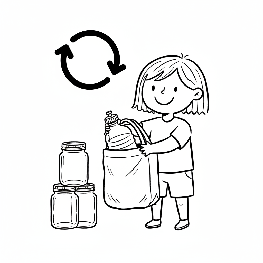 Kind mit wiederverwendbarer Flasche und Gläsern, Recycling-Symbol.