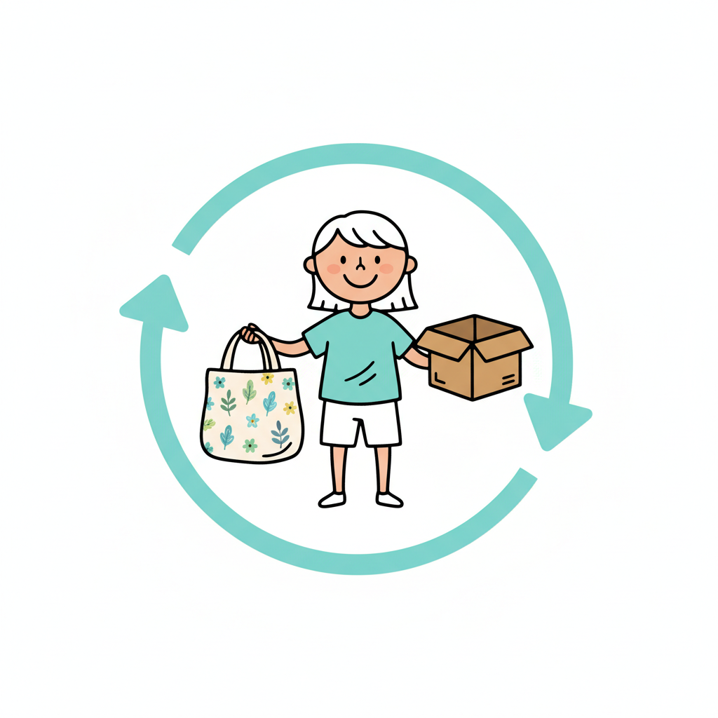 Cartoonfigur mit Stofftasche und Karton im Recycling-Kreis, symbolisiert Wiederverwendung.