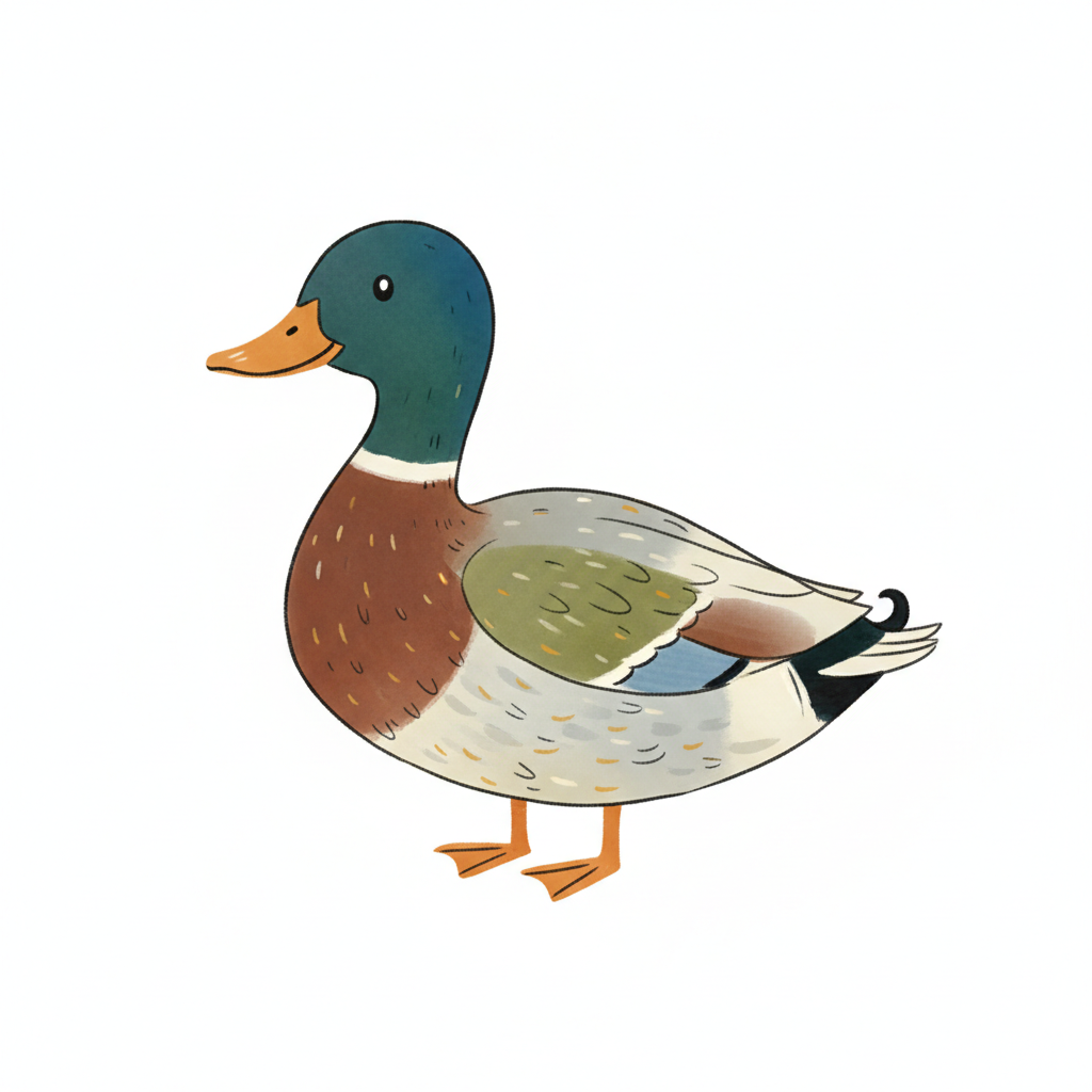 Bunte, cartoonartige Ente mit grünem Kopf und braunem Körper.