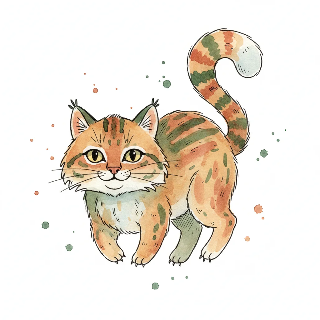 Eine süße, gezeichnete Katze mit buntem Fell und fröhlichem Ausdruck.