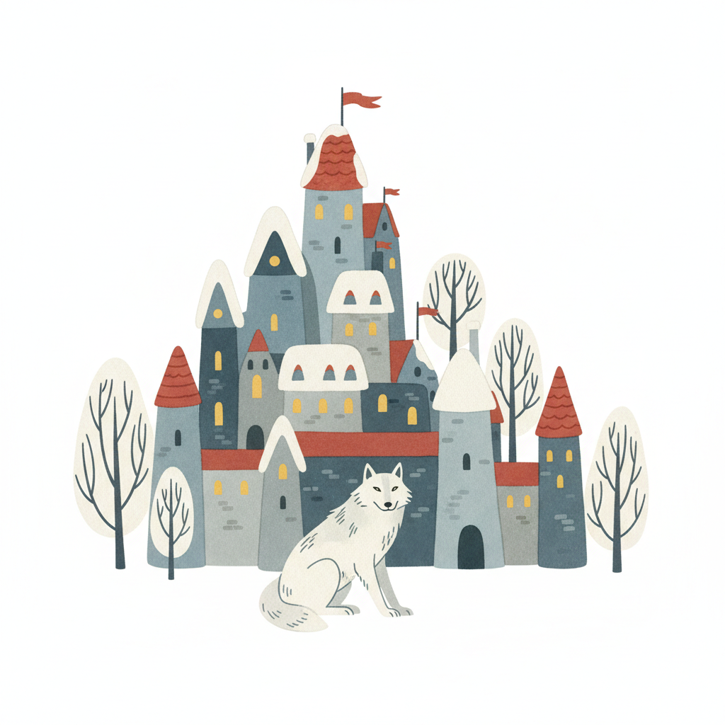 Illustration eines Winterdorfes/Schlosses mit schneebedeckten Dächern und einem weißen Wolf im Vordergrund.