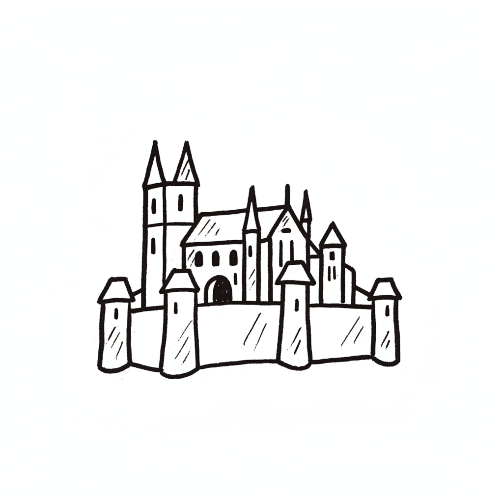 Schwarz-weiße Strichzeichnung einer mittelalterlichen Burg mit mehreren Türmen und einer Festungsmauer.