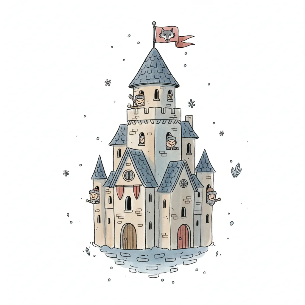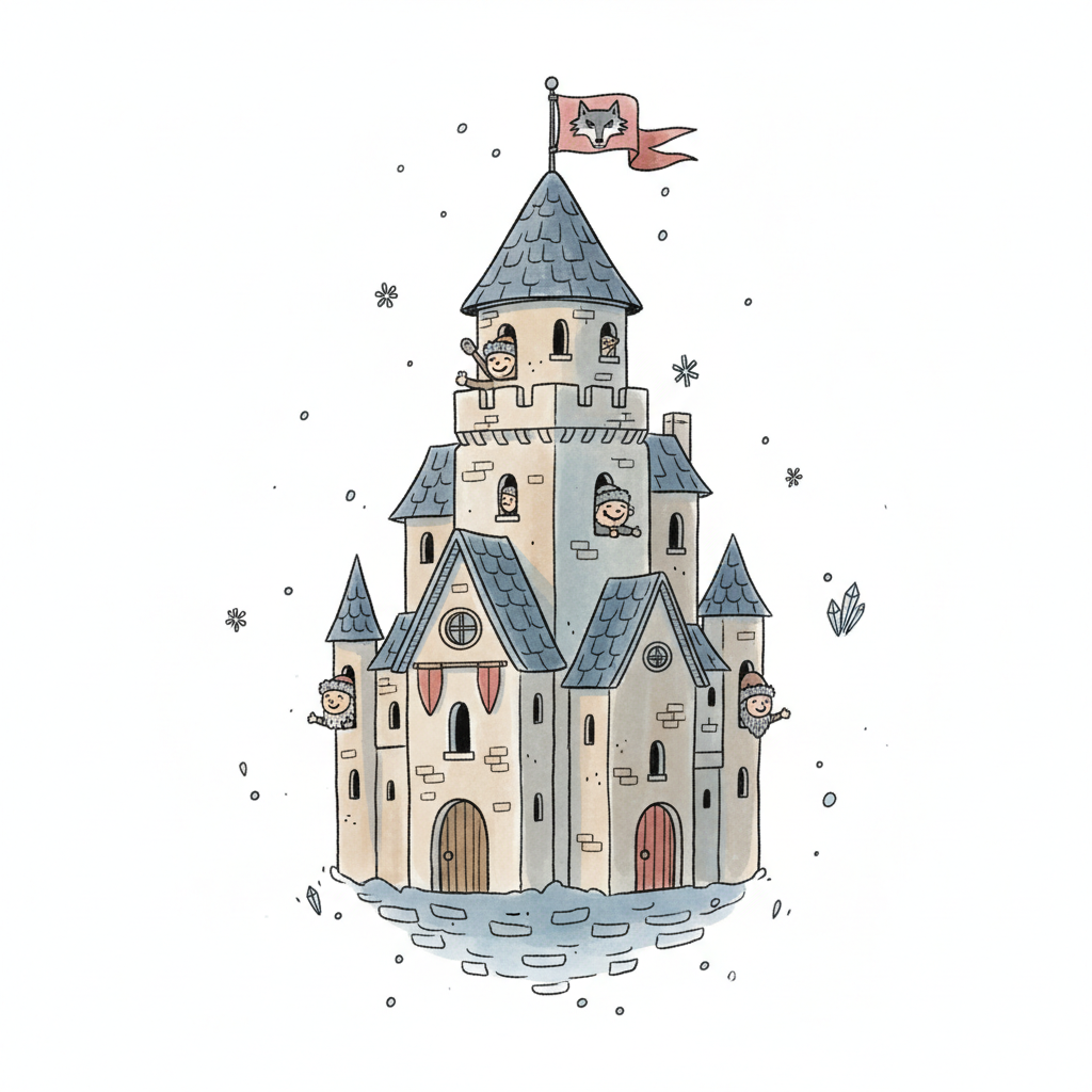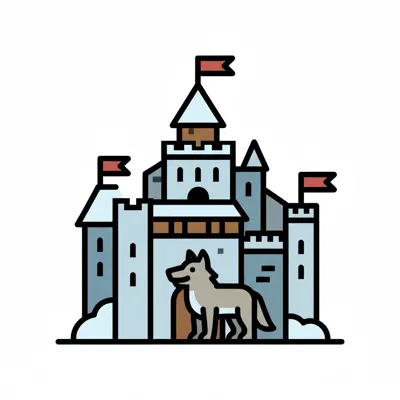 Minimalistische Illustration eines Schlosses mit Türmen, roten Flaggen und einem Wolf davor.