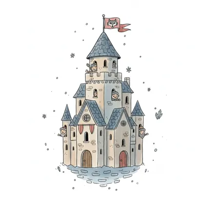 Ein gezeichnetes, schneebedecktes Schloss mit rauchenden Schornsteinen und Winterbäumen.