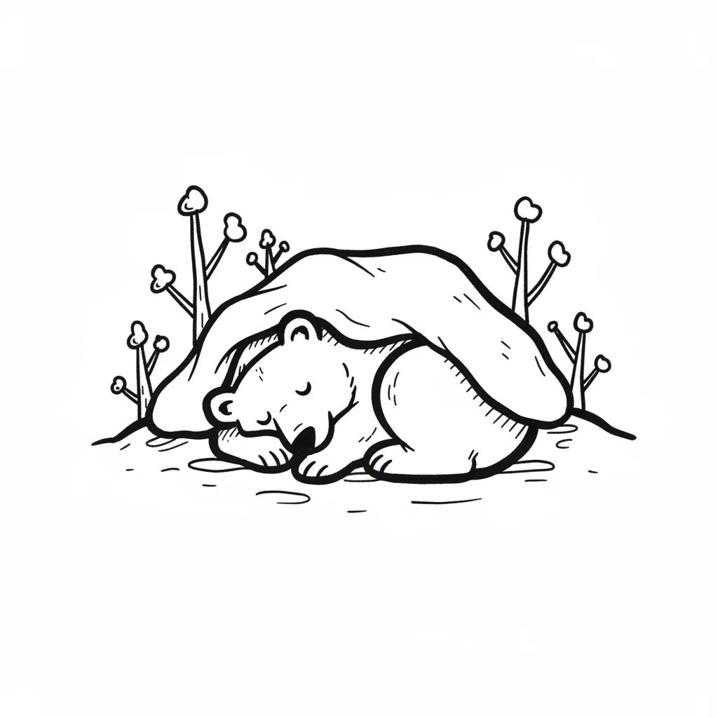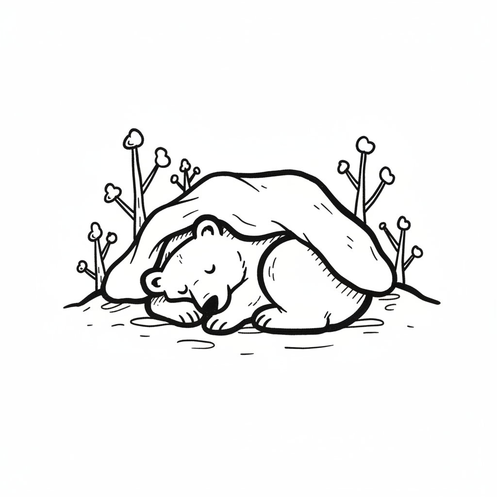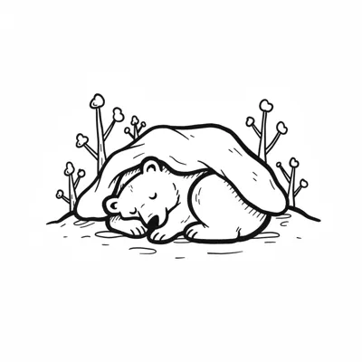Ein süßer Cartoon-Bär schläft friedlich unter einem Felsen, umgeben von kleinen Bäumen.