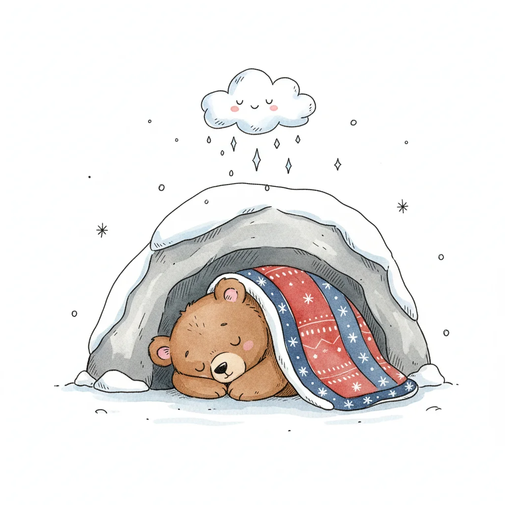 Ein süßer Bär schläft gemütlich unter einer Decke in seiner verschneiten Höhle, während es schneit.