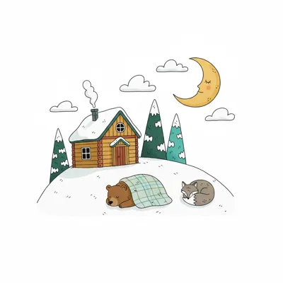 Gemütliche Winterlandschaft mit Hütte, schlafendem Bären und Fuchs unter dem Mond.