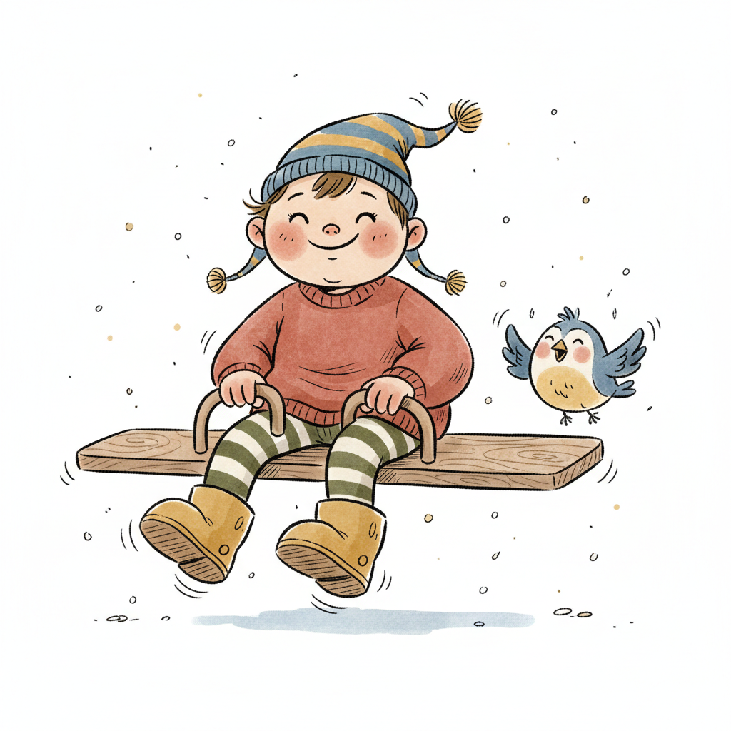 Fröhliches Kind in Winterkleidung sitzt auf einem Schlitten mit einem Vogel. Winterliche Freude.