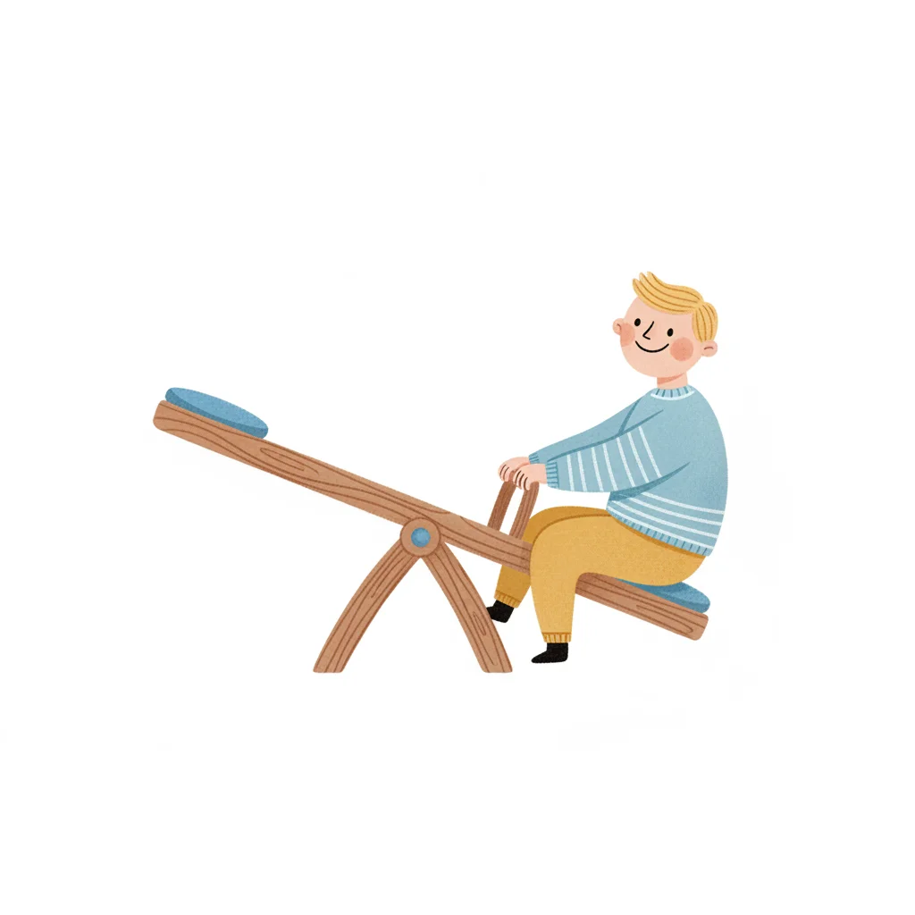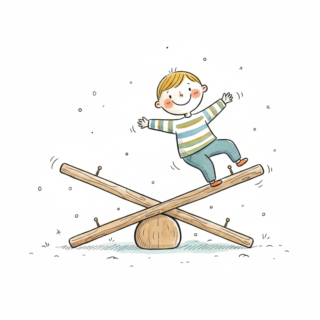 Fröhlicher Cartoon-Junge balanciert auf einer Wippe mit ausgestreckten Armen.