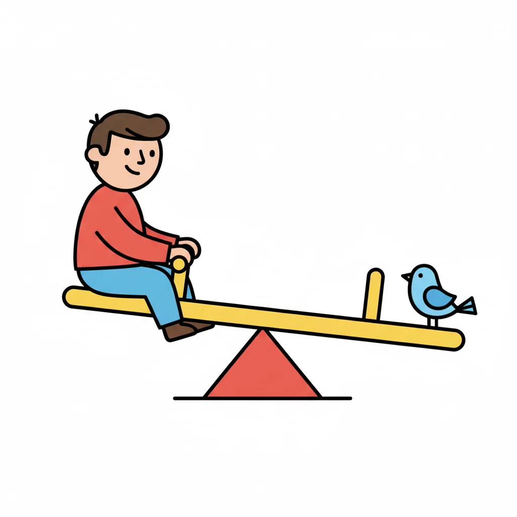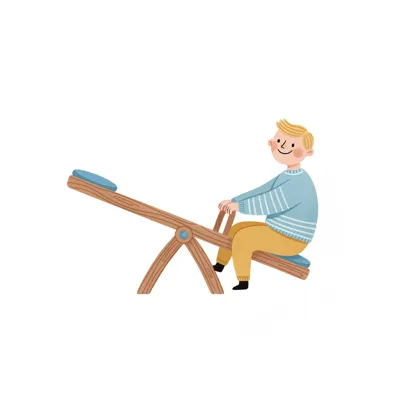 Ein Junge sitzt auf einer Wippe, gegenüber ein kleiner blauer Vogel. Die Wippe ist ungleichmäßig.