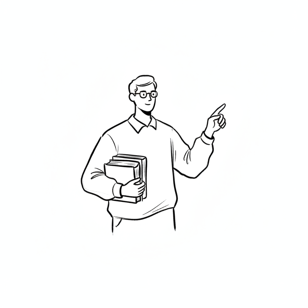 Ein Mann mit Brille hält Bücher und zeigt nach oben.