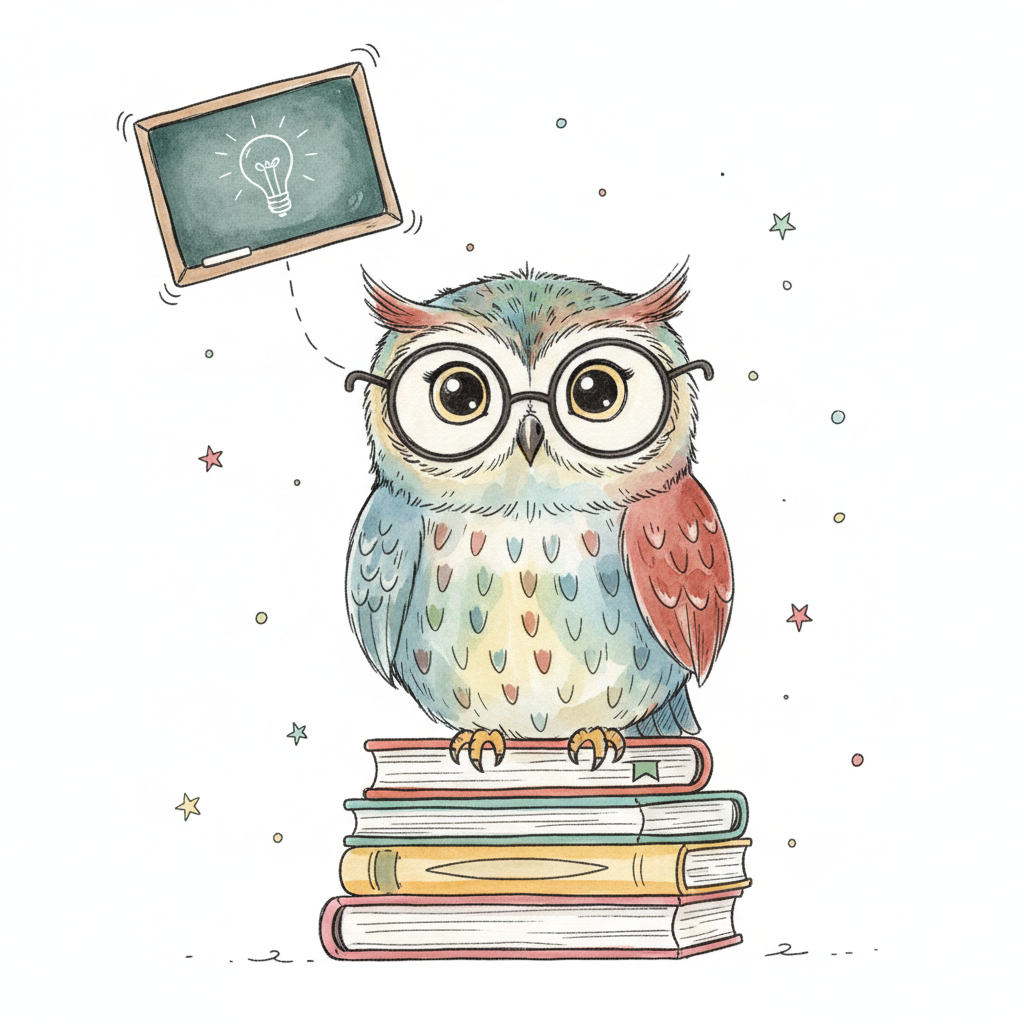 Eine weise Eule auf Bücherstapeln mit einer Tafel darüber.