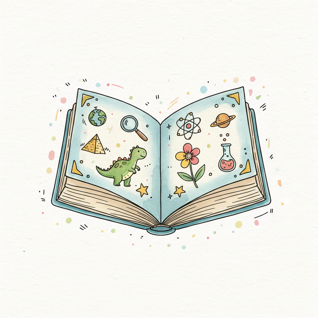 Ein aufgeschlagenes Buch mit bunten Illustrationen von Wissenschaft und Natur.