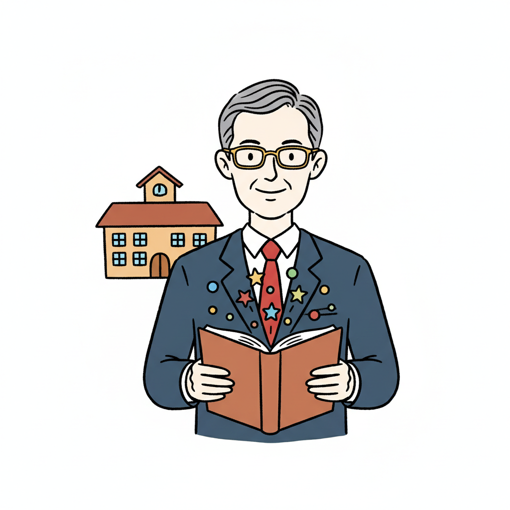 Ein Mann mit Brille hält ein Buch, im Hintergrund ein Schulgebäude.