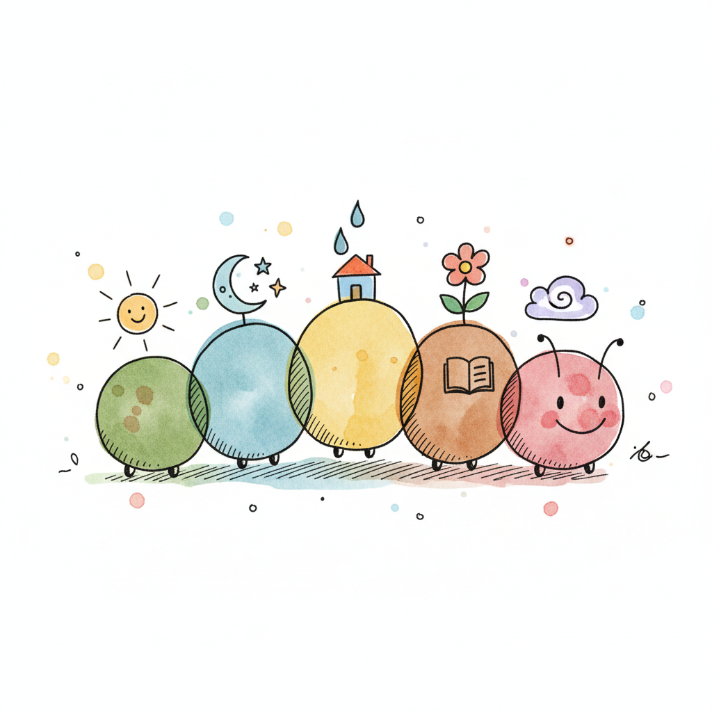 Minimalistische, handgzeichnete Illustration mit deutlich handgezeichneter Wirkung. Handgezeichnete Schwarze Konturen ungleichmäßig und unregelmäßig von Hand gezeichnet. Figuren werden mit stark vereinfachten Körperformen dargestellt. Arme und Beine sind nur als einfache Linien oder Strichformen angedeutet. Flächige Farben ohne Verläufe oder Texturen, ruhige harmonische Farbpalette und reduzierte Details sorgen für eine klare, kindgerechte Darstellung. Saubere, übersichtliche Komposition mit rein weißem Hintergrund.