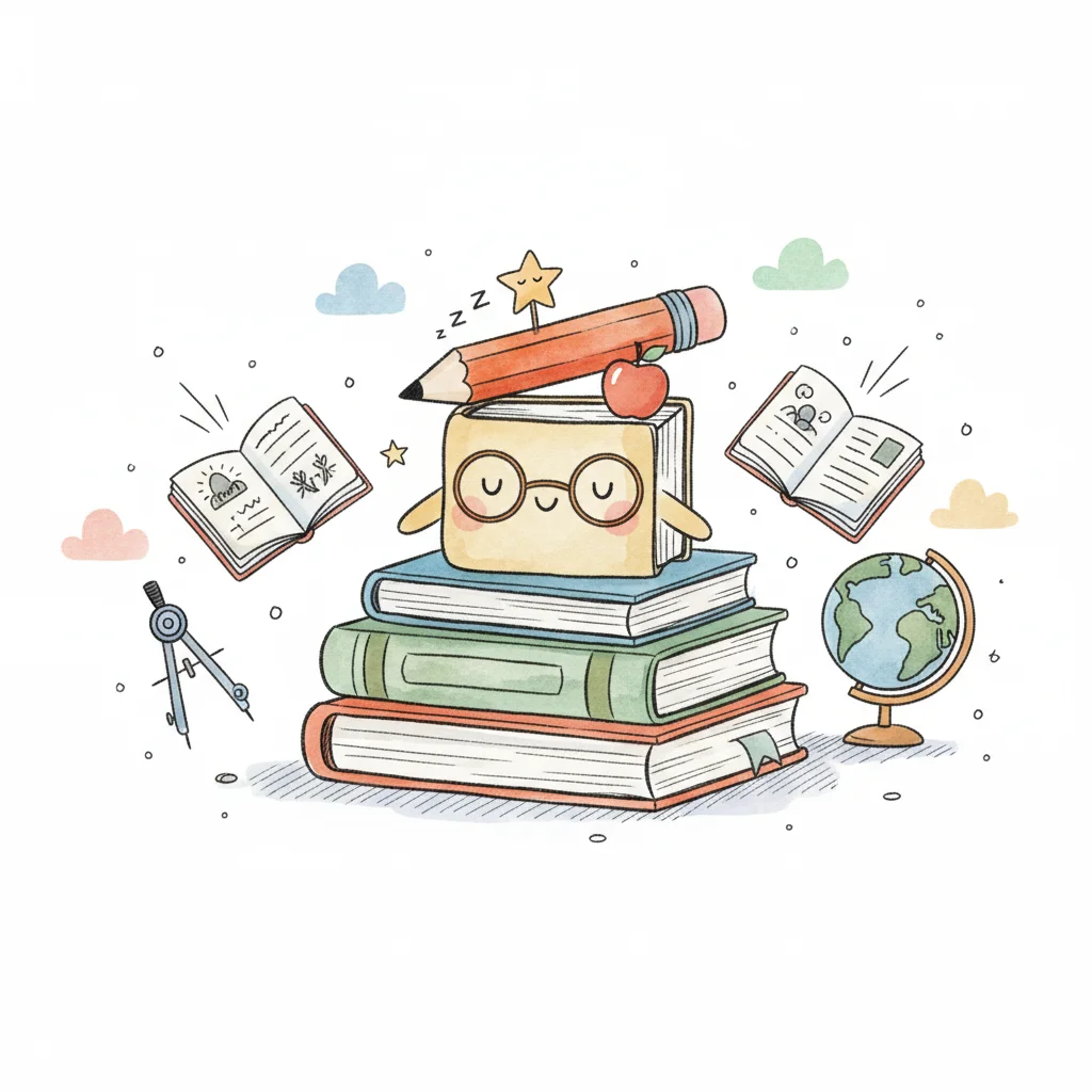 Ein Stapel Bücher mit einem lächelnden Buch und Schulmaterialien.