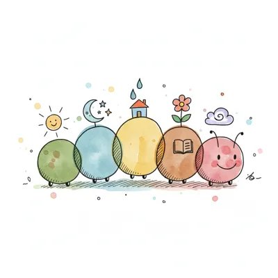 Bunte Käfer mit verschiedenen Symbolen für Glück, Natur und Wissen.