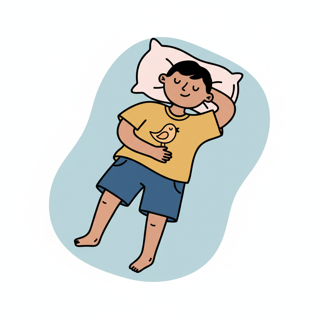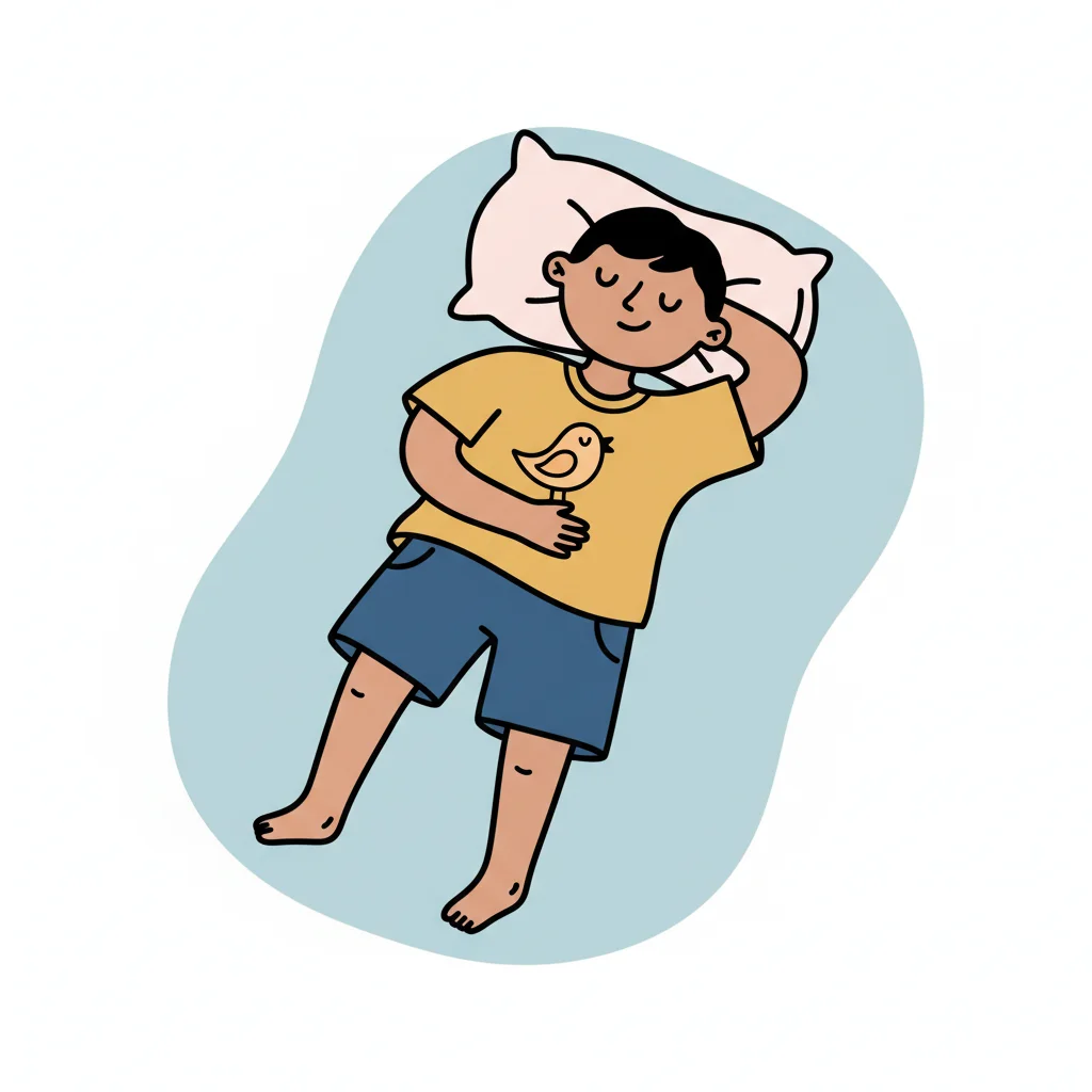 Ein Junge schläft friedlich mit einem Kissen und einem kleinen Vogel.