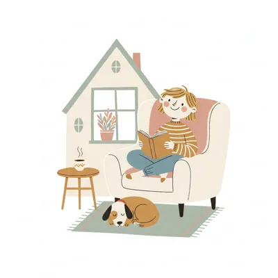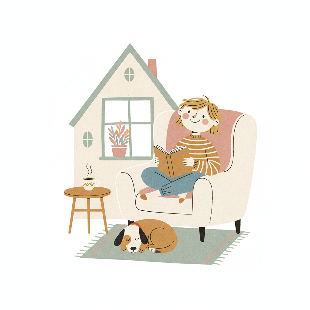 Eine Person liest gemütlich im Sessel, ein Hund schläft davor. Eine Tasse Tee steht bereit.