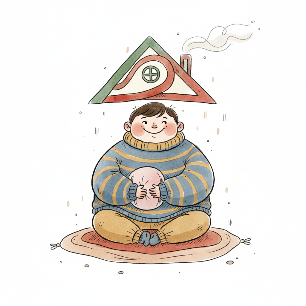 Handgezeichnete Kinderbuchillustration im modernen skandinavisch-nordischen Stil. Minimalistische, freundliche mit einfachen Formen und leicht unregelmäßigen, handgezeichneten Linien. Ruhige, gedeckte Farbpalette, viel freie Fläche, reduzierte Details, sanfte Papier- oder Aquarellstruktur. Warme, ruhige, leicht humorvolle Stimmung, flächige Komposition ohne starke Perspektive, moderner nordischer Illustrationsstil, charmant und zeitlos. Hoher Kontrast, isoliert auf weißem Hintergrund. WICHTIG: KEIN TEXT im Bild. Hintergrund: Rein weiß.