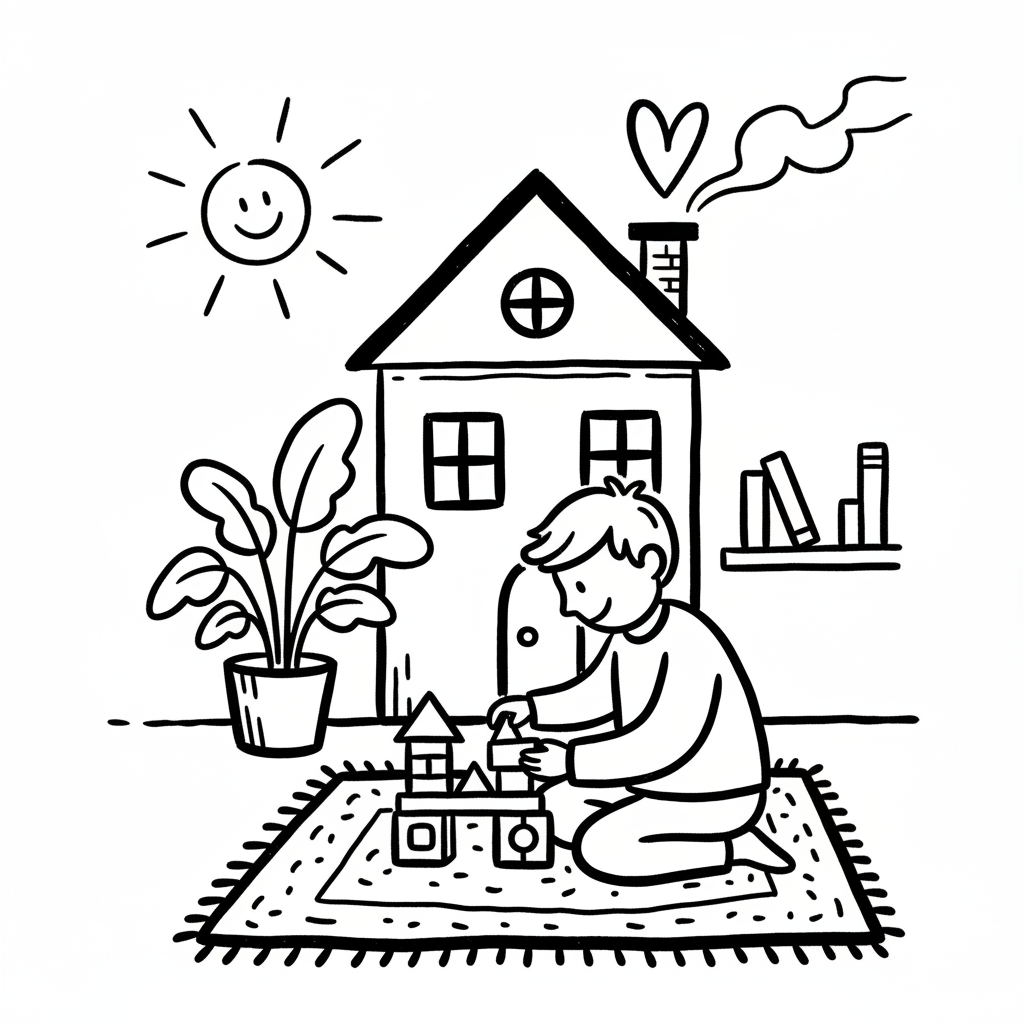 Glückliches Kind spielt mit Bauklötzen auf dem Teppich, Haus und Sonne im Hintergrund.