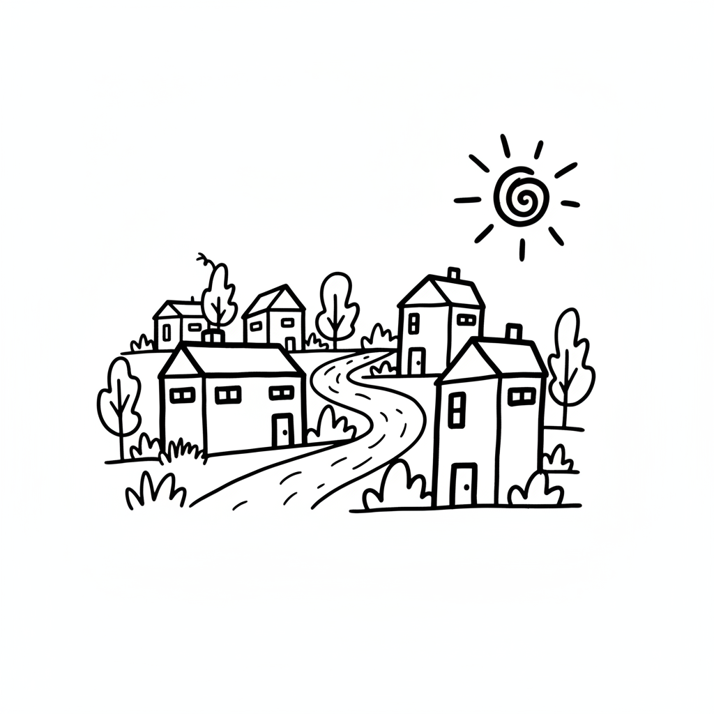 Strichzeichnung eines Dorfes mit Häusern, kurviger Straße, Bäumen und Sonne.