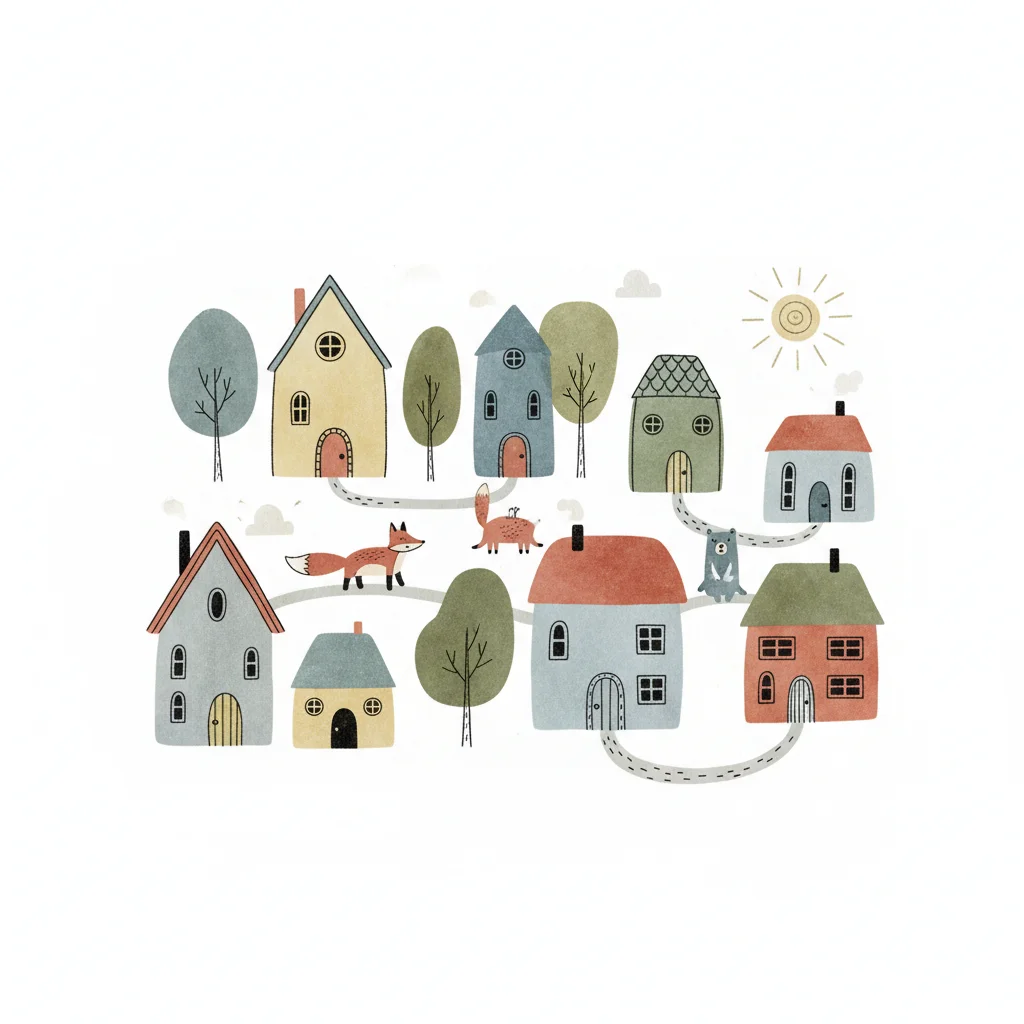 Bunte, eng aneinandergereihte Häuser in einem charmanten, handgezeichneten Stil.
