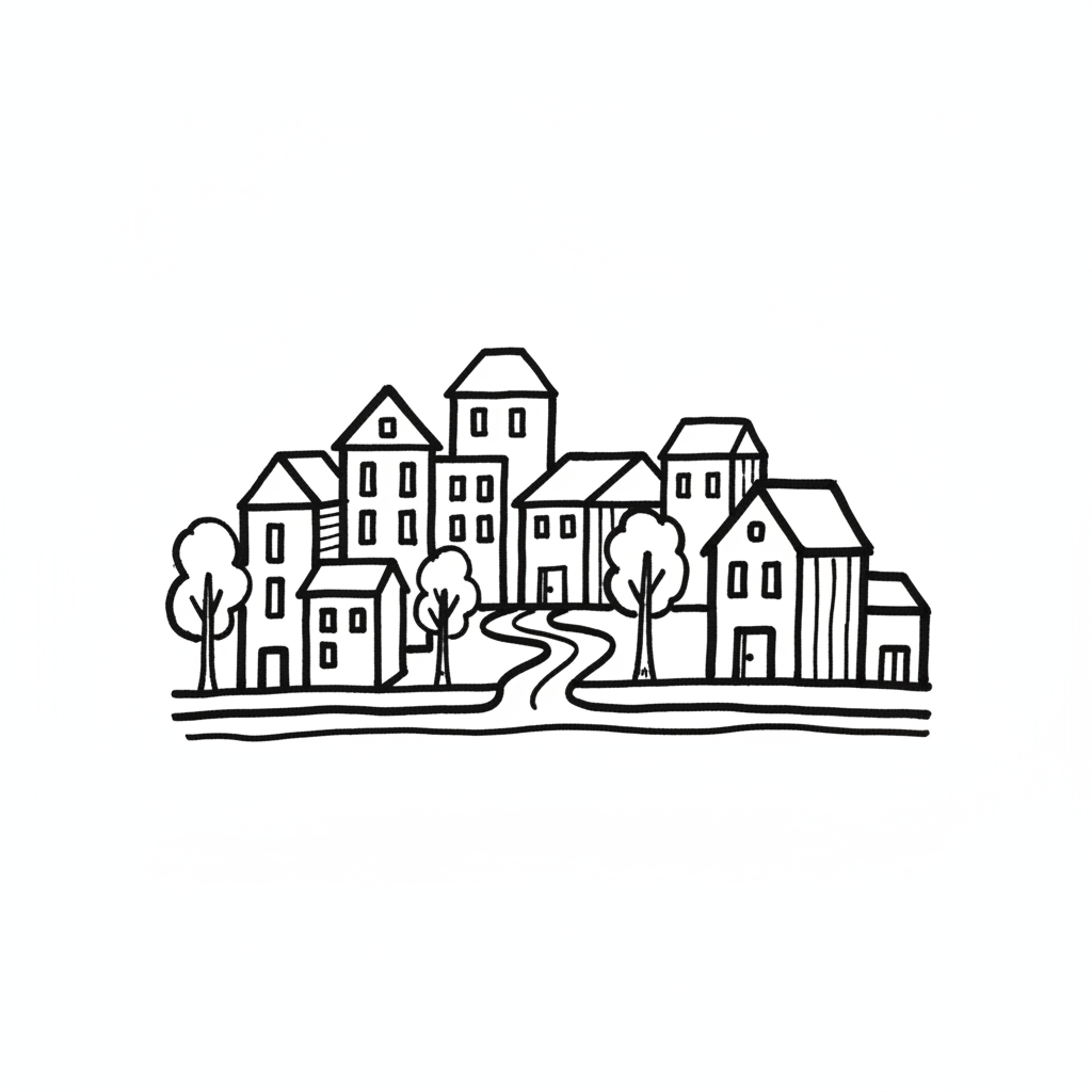 Schwarz-weiße Strichzeichnung einer kleinen Stadt mit Häusern, Bäumen und einem gewundenen Weg.