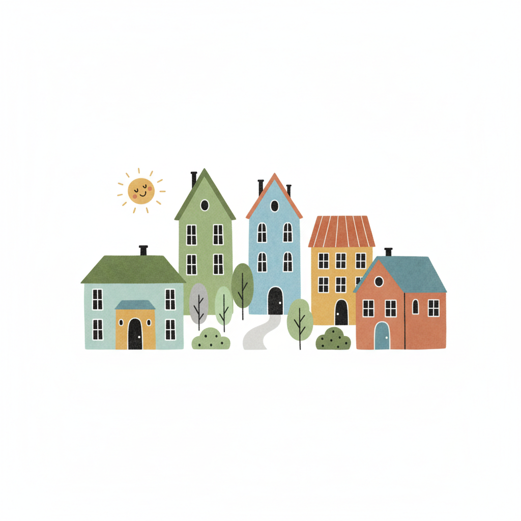 Bunte Häuserreihe mit Bäumen, Büschen und lächelnder Sonne im Cartoon-Stil.