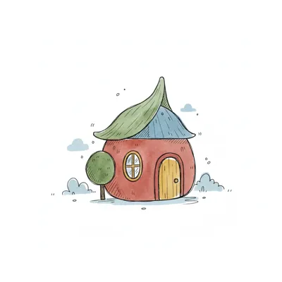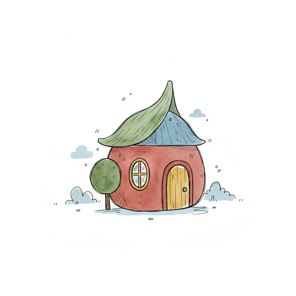 Niedliches, rundes Märchenhaus mit Blattdach und kleinem Baum, im Aquarellstil.
